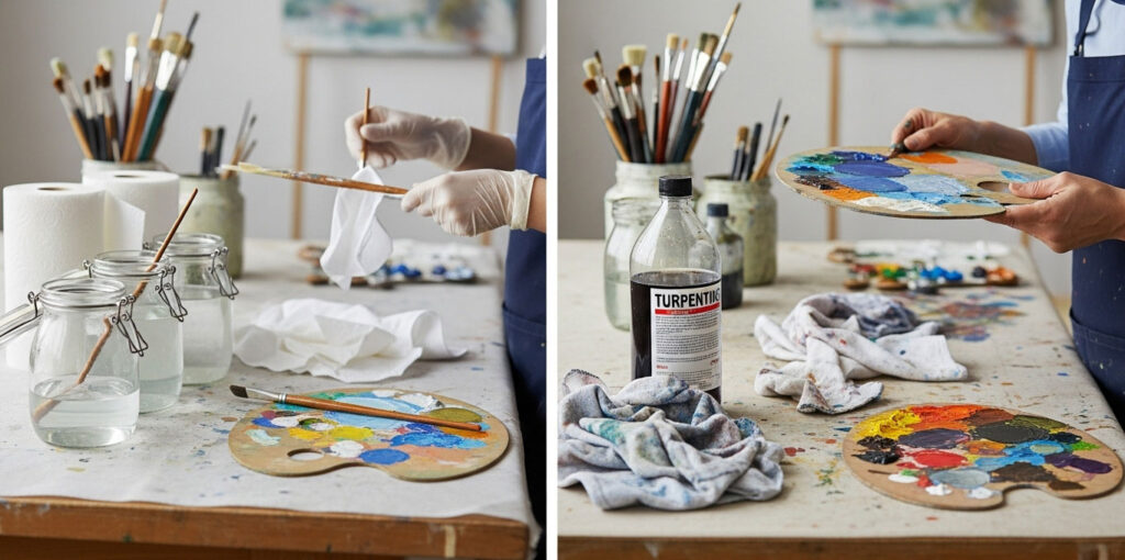 - Óleo: Exige solventes (terebentina, aguarrás) para diluir e limpar. O cheiro pode ser forte e o processo de limpeza é mais complexo.